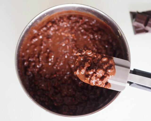 het niet verbrandt. - Kruimel de rijstwafels in kleine stukjes boven het pannetje wanneer alles gesmolten is.